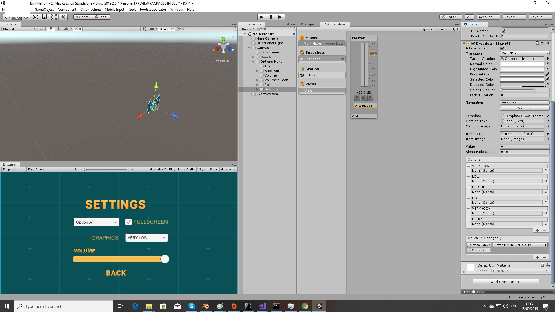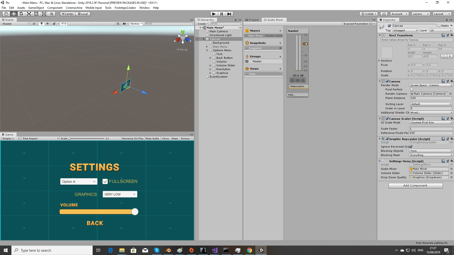 在画布上,我有一个附加了SettingsMenu的脚本: