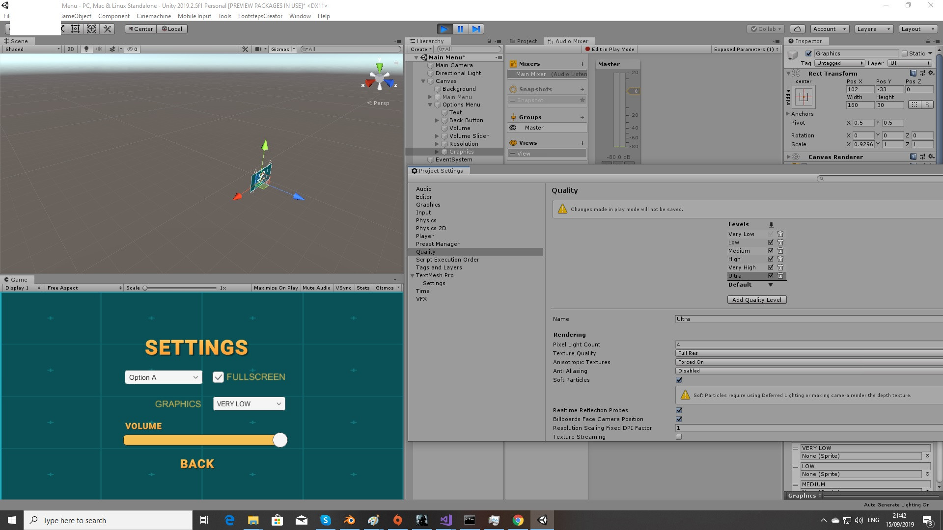 然后在运行游戏和编辑>项目设置窗口时.质量是打开的,当我在游戏中改变它在大多数情况下的质量几乎20-30秒,以改变它在编辑器质量窗口。而且它应该实时改变它。