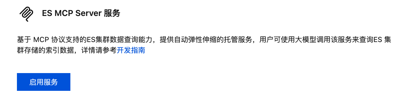 ES MCP Server 目前仅支持集群与 Server 一对一连接模式,即一个集群可开启一个 MCP Server,该 Server 仅可查询所属集群的数据。