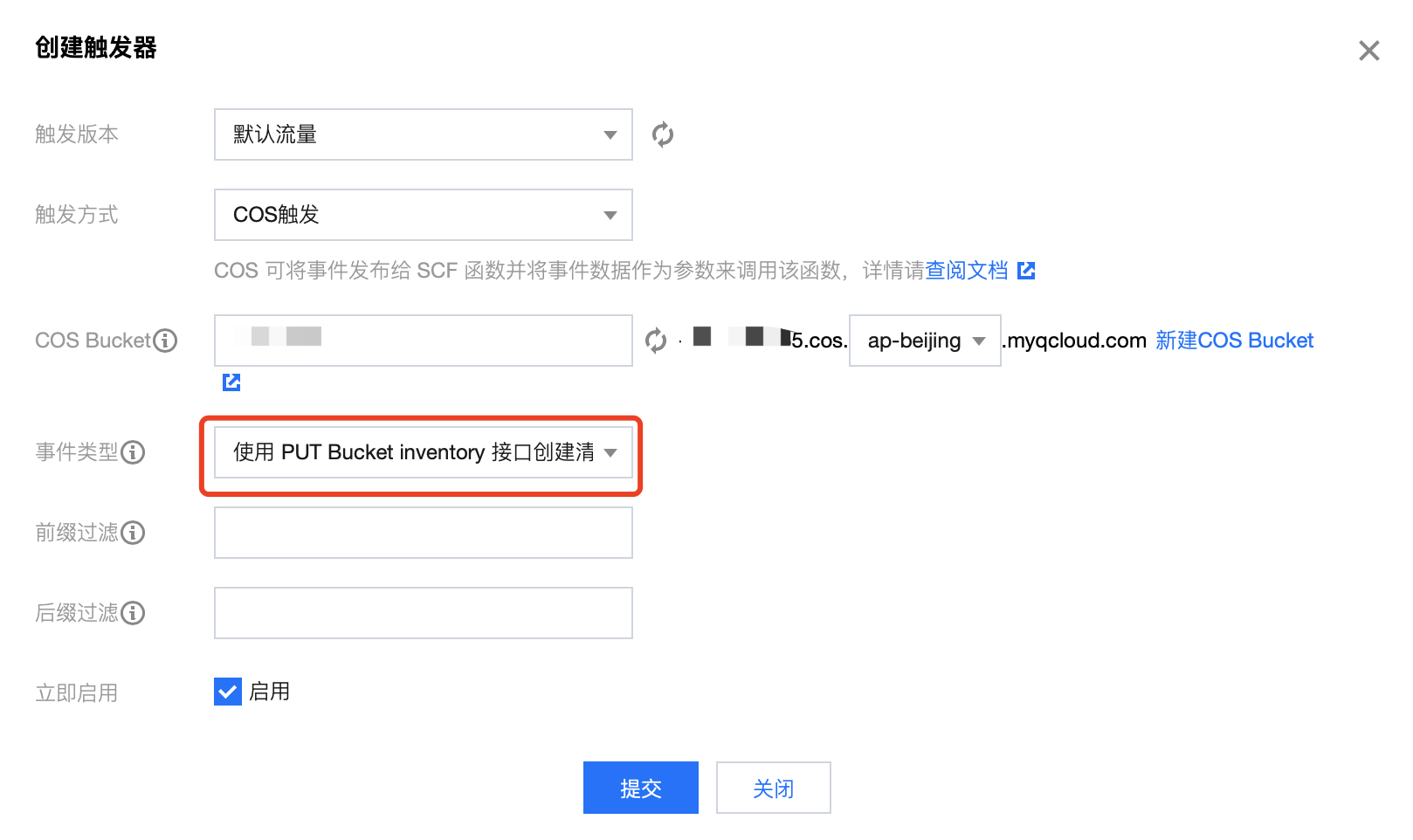 如果您需要在清单投递成功后收到通知,可以在 云函数 控制台上配置 COS 触发器,设置事件类型为完成文件清单报告投递事件。