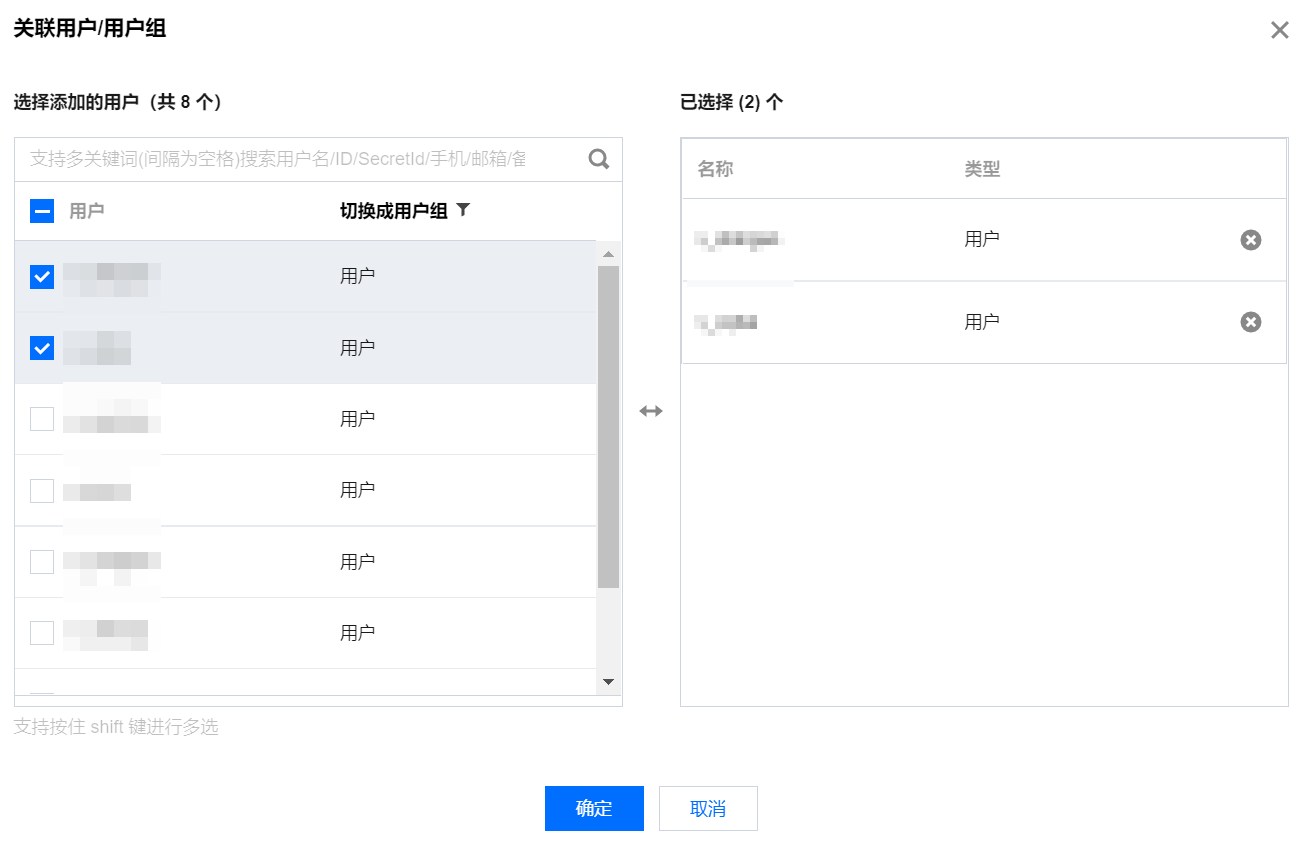 在弹出的“关联用户/用户组”窗口中,选择您需要添加的用户,进行授权。