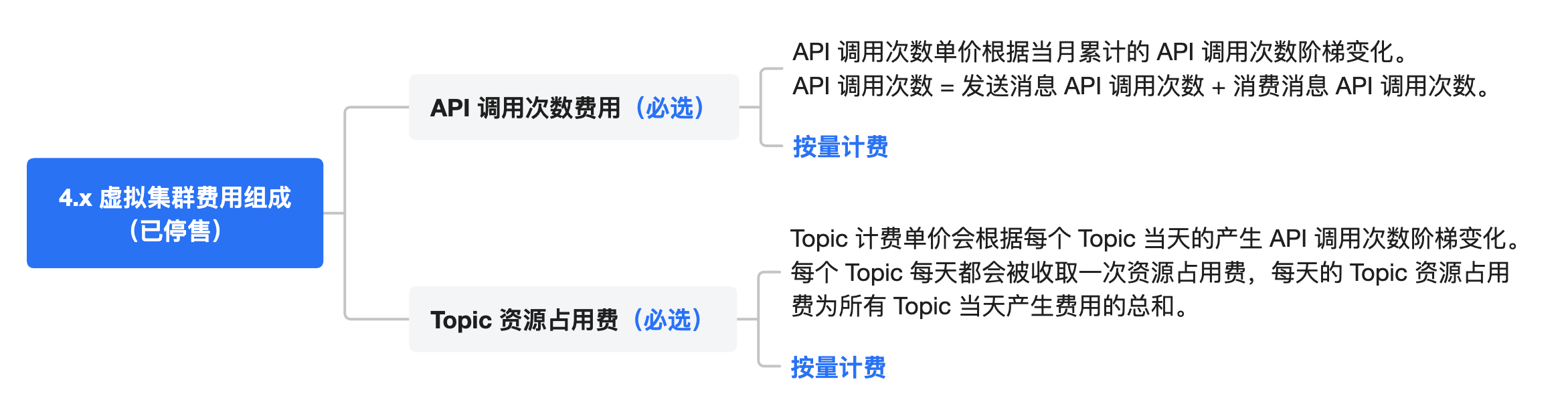 集群整体价格 = API 调用次数费用(发送消息 API 调用次数费用 + 消费消息 API 调用次数费用)+ Topic 资源占用费用
