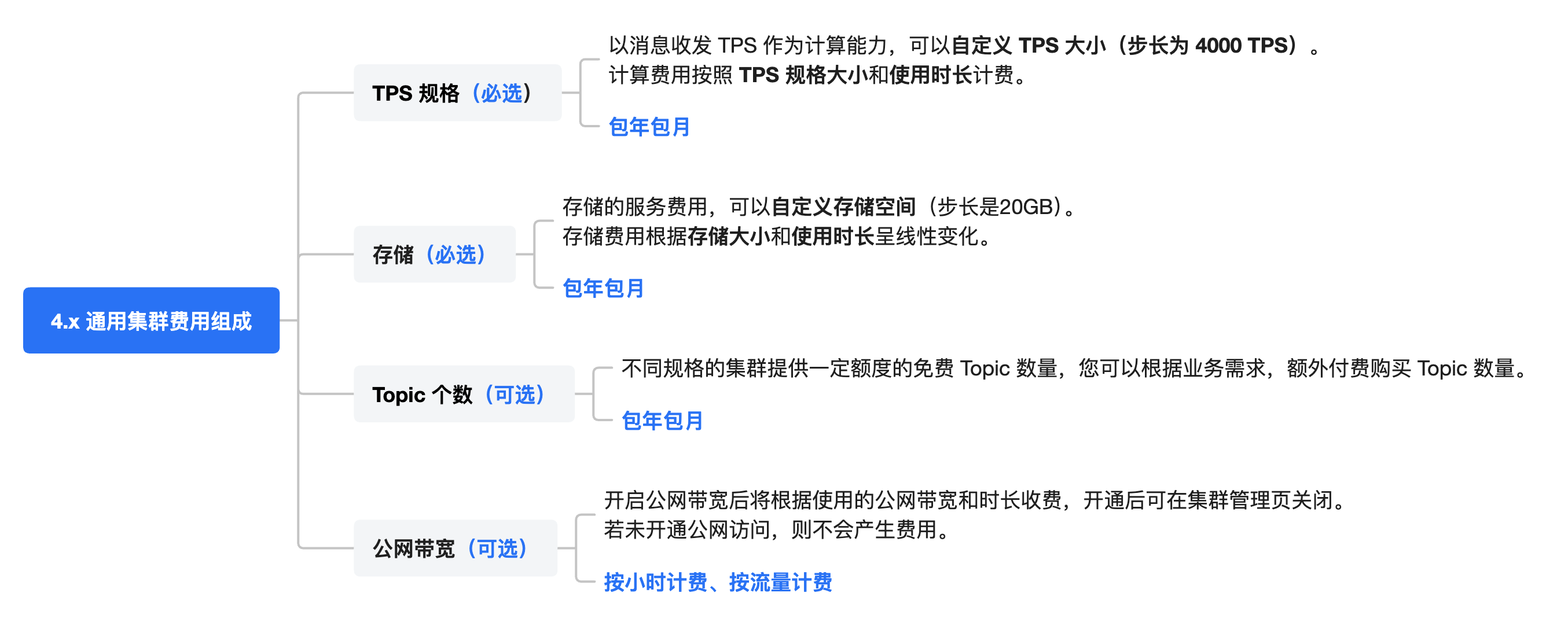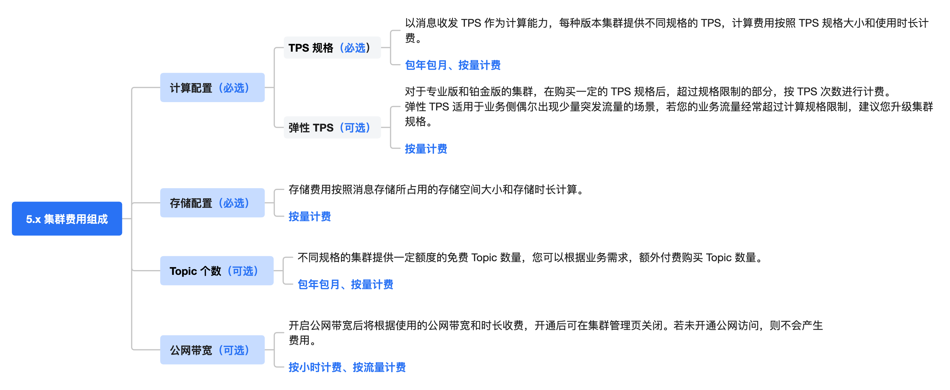 集群整体价格 = 计算配置费用 + 存储配置费用 + 额外购买 Topic 费用 + 公网带宽费用 = TPS 规格 × TPS 单价 + 存储规格 × 存储单价 + 额外购买 Topic 数量 × Topic 单价 + 公网带宽大小 × 公网带宽单价。