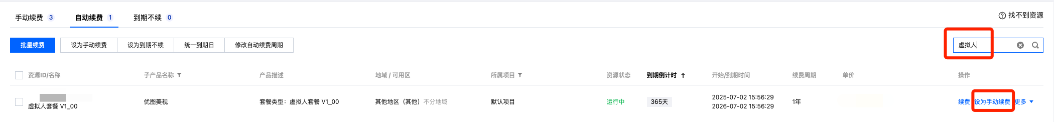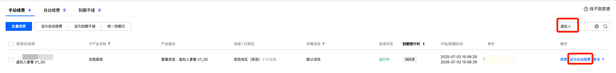 1. 在左侧菜单栏选择 续费管理,您可以选择到期时间范围并搜索虚拟形象的产品名,查看已购买的 License 资源。