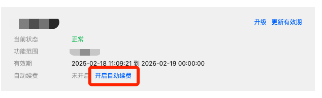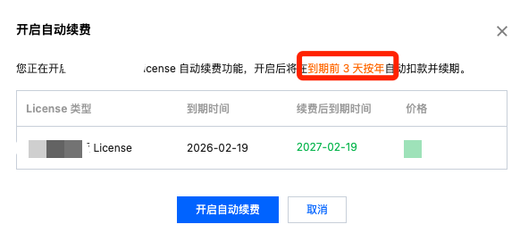 1. License 的自动续费在“未开启状态”下可单击开启自动续费,到期前3天将按年自动扣款并续期。