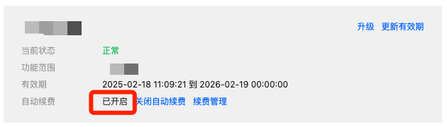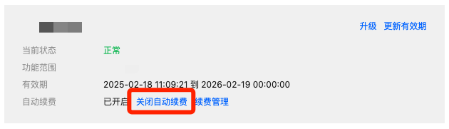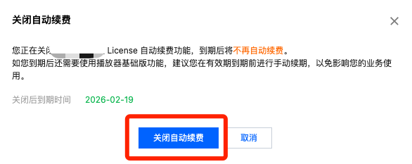 1. License 的自动续费在已开启状态下可点击关闭自动续费,到期后将不再自动续费。