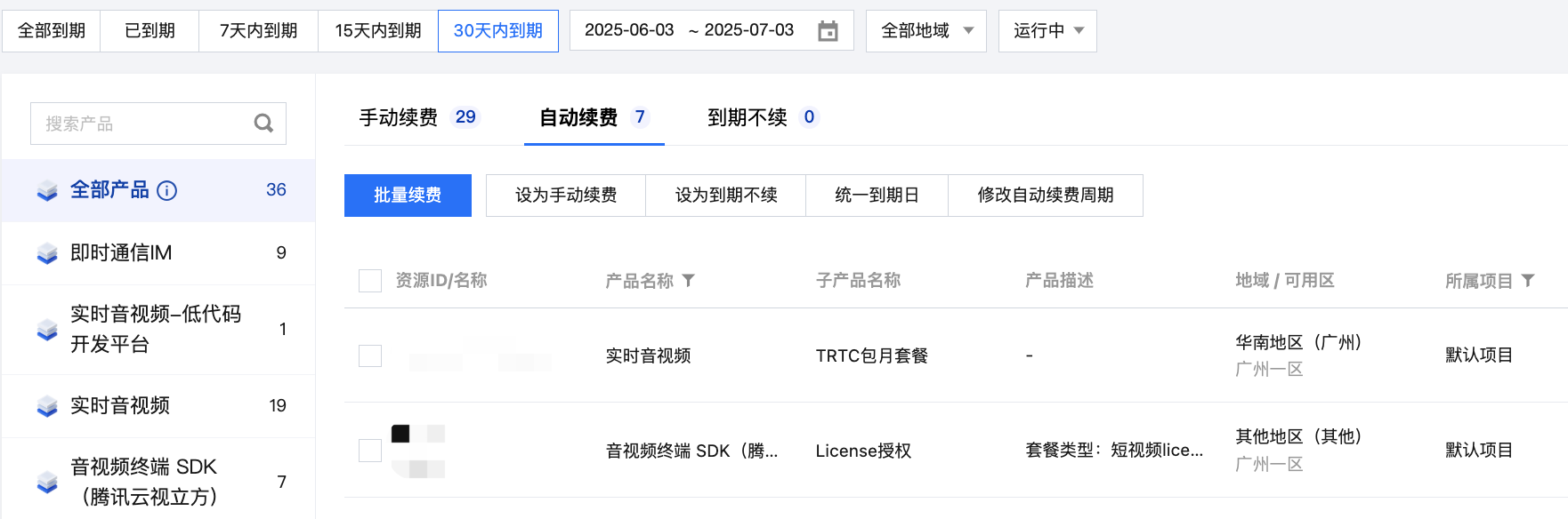 批量续费:勾选所有需要续费的 License,单击列表上方的批量续费。