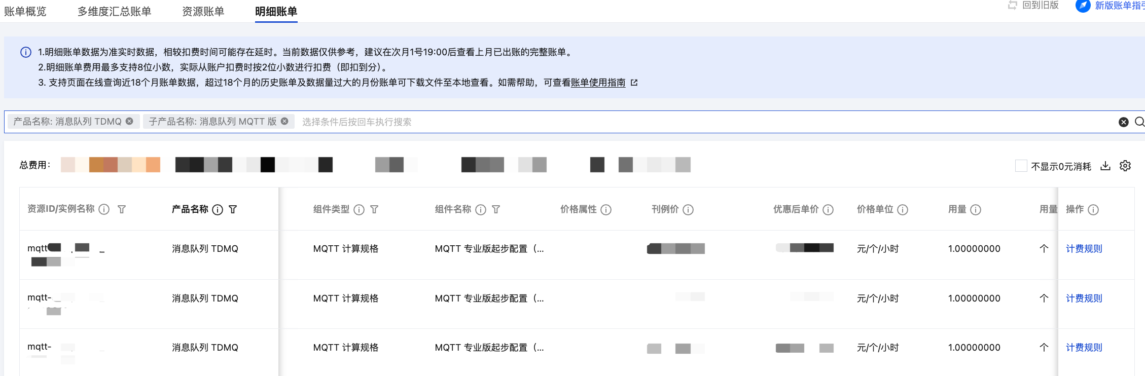 明细账单:在账单查看页面选择明细账单页签,产品名称选择消息队列 TDMQ,子产品名称选择消息队列 MQTT 版,可以查看每个集群在计费周期内各计费项详细的费用。
