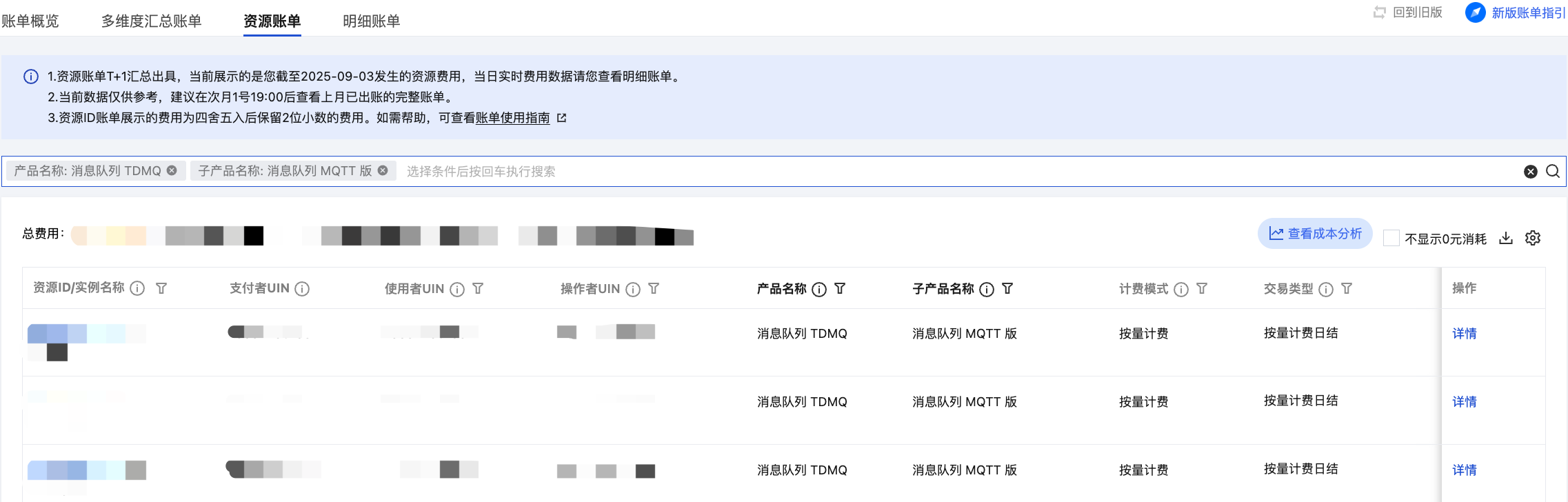 资源账单:在账单查看页面选择资源账单页签,产品名称选择消息队列 TDMQ,子产品名称选择消息队列 MQTT 版,可以查看各集群的消费明细,单击操作栏的详情,可以查看该集群详细的计费信息。
