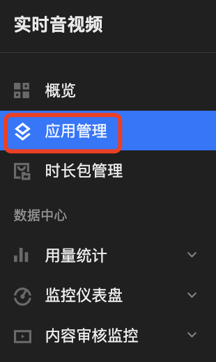 1. 登录 实时音视频控制台,在左侧导航栏中,单击应用管理。