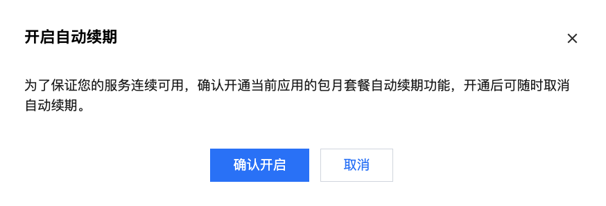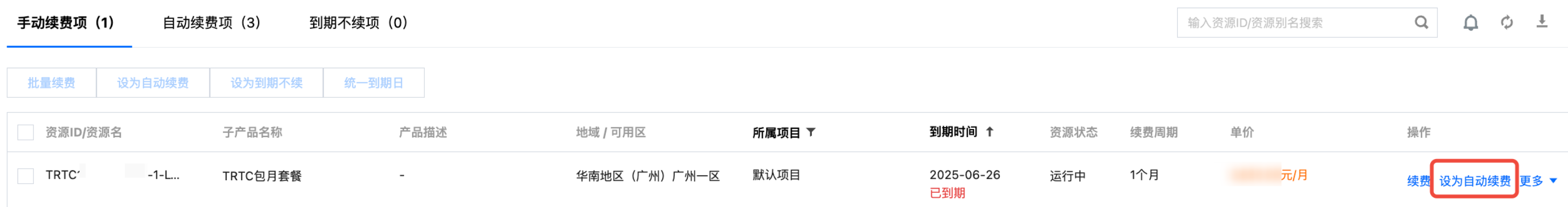 您可以通过实时音视频控制台和费用中心 2 种方式开启自动续费,具体如下: