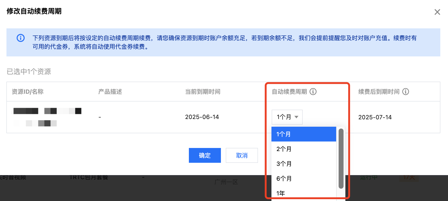 1. 点击 更多 -> 修改自动续期周期,在弹出的窗口确认产品信息。