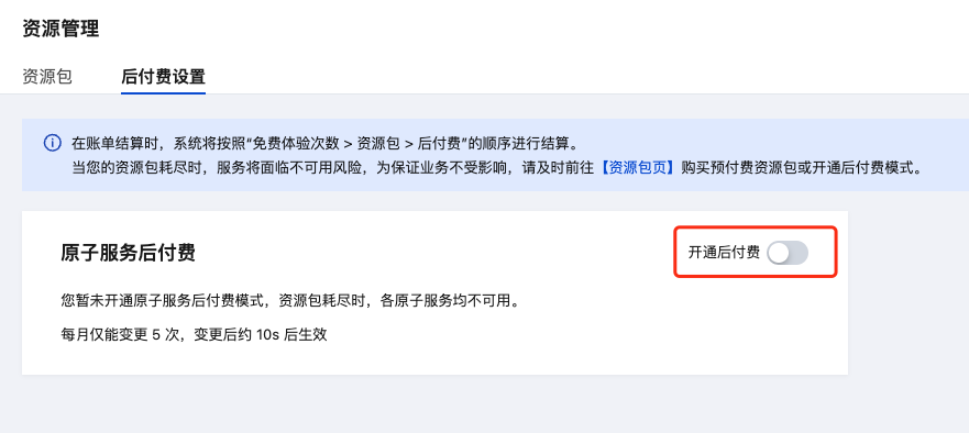 当开通智能搜索开发原子服务后,默认情况下会自动打开后付费,免费体验次数使用完后,若未购买预付费资源包,将会自动转入后付费。如需开启或关闭后付费模式结算,请前往控制台 -> 资源管理 -> 后付费设置 开通或关闭后付费。