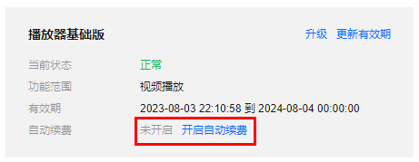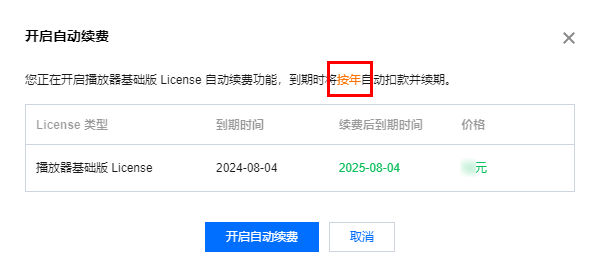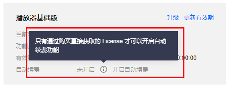 1. License 的自动续费在“未开启状态”下可单击开启自动续费,到期前3天将按年/按月自动扣款并续期。