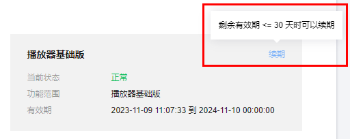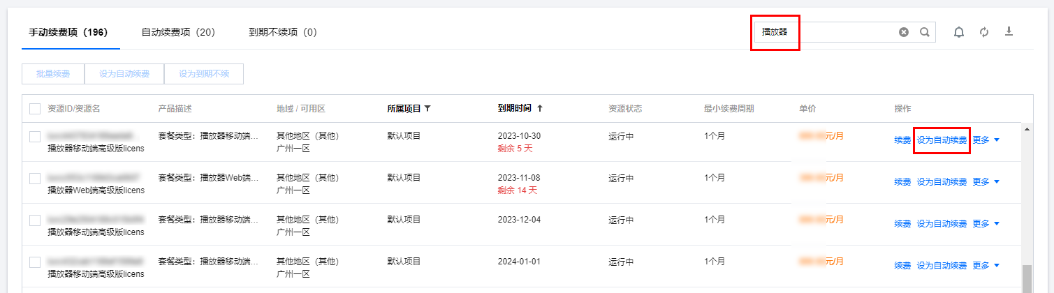 1. 在左侧菜单栏选择 续费管理,您可以选择到期时间范围并搜索播放器 License 的产品名,查看已购买的 License 资源。