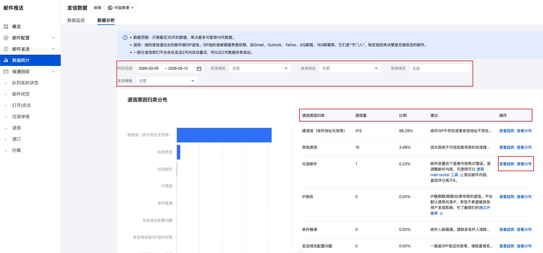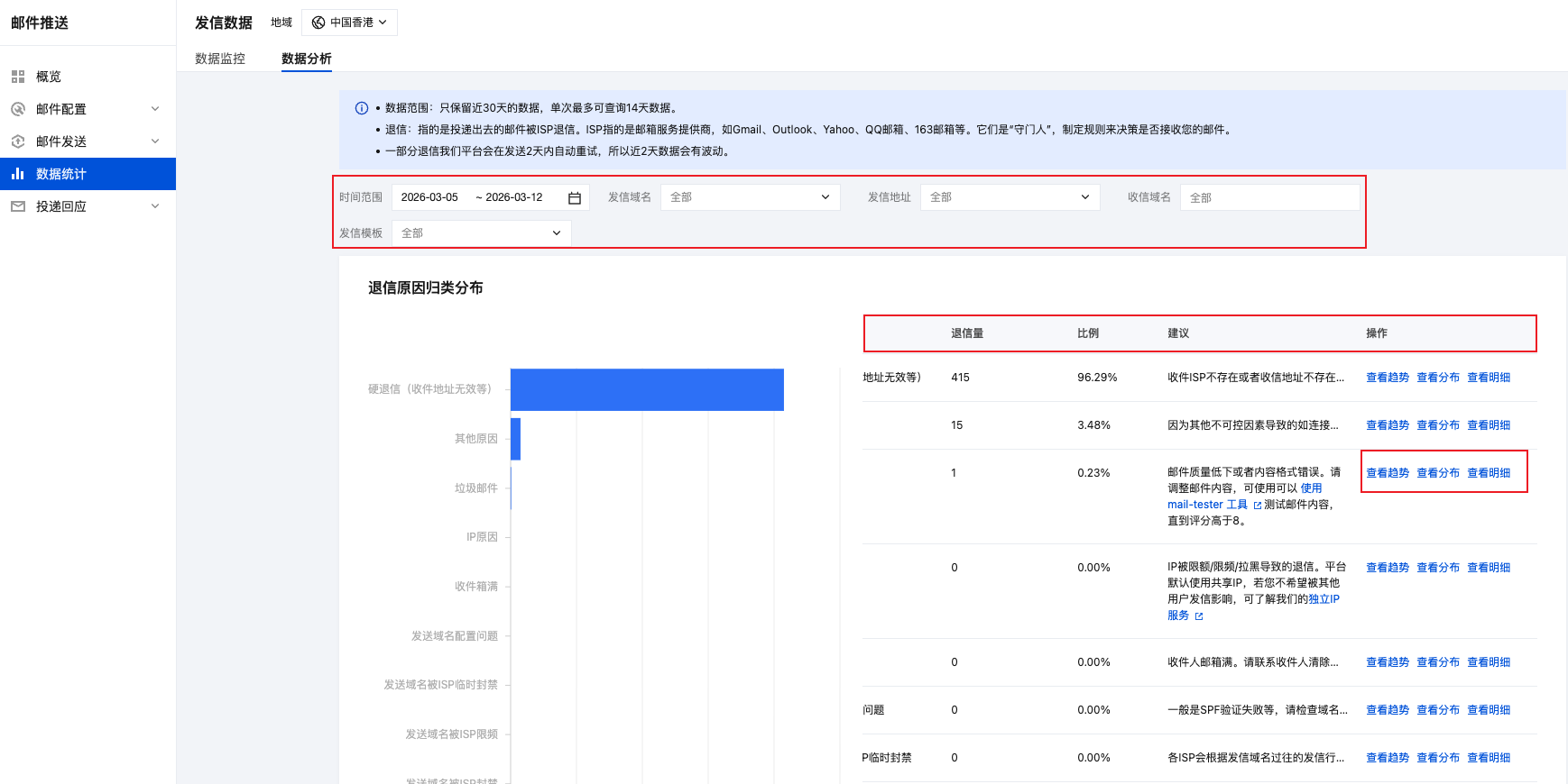 2. 送达率低即退信率高的原因在 控制台 > 数据统计 > 数据分析 查看,支持定位原因、根据建议优化、查看明细。