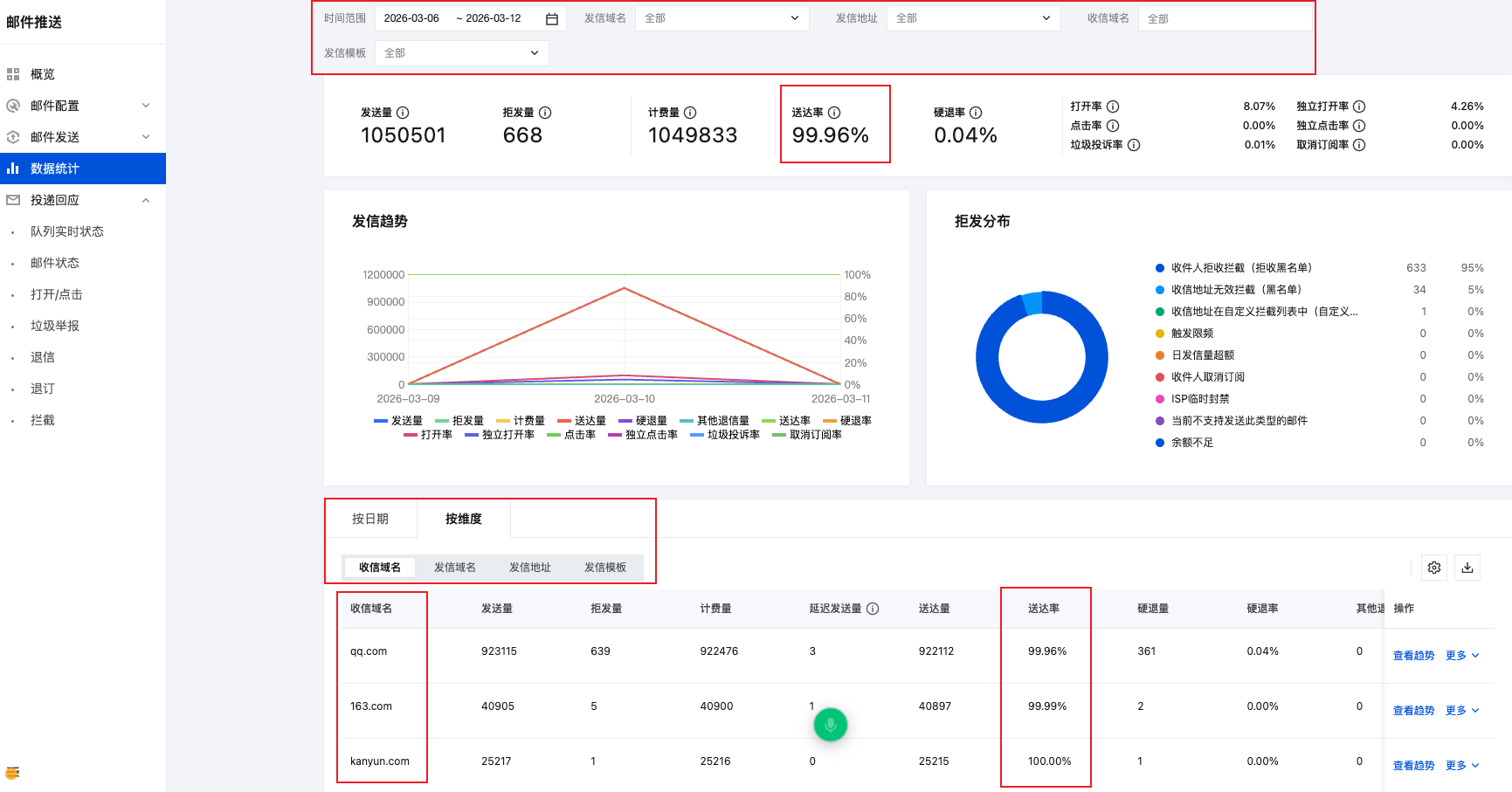 1. 在 控制台 > 数据统计 > 数据监控 查看送达率数据,可以按照不同的维度查看(日期/发信域名/收信域名/发信模板/发信地址)
