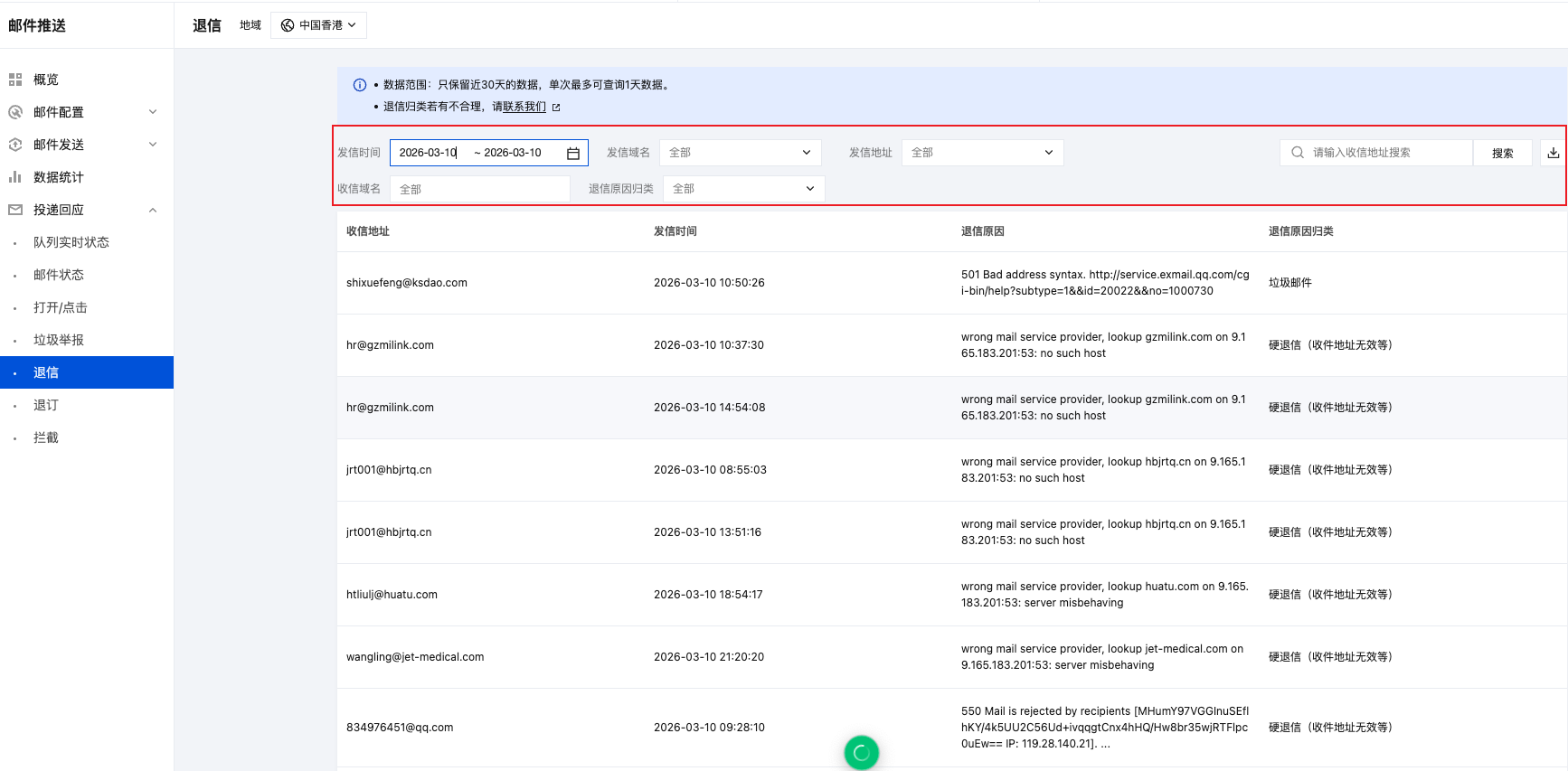 2.2 退信明细查看:控制台-投递回应-退信