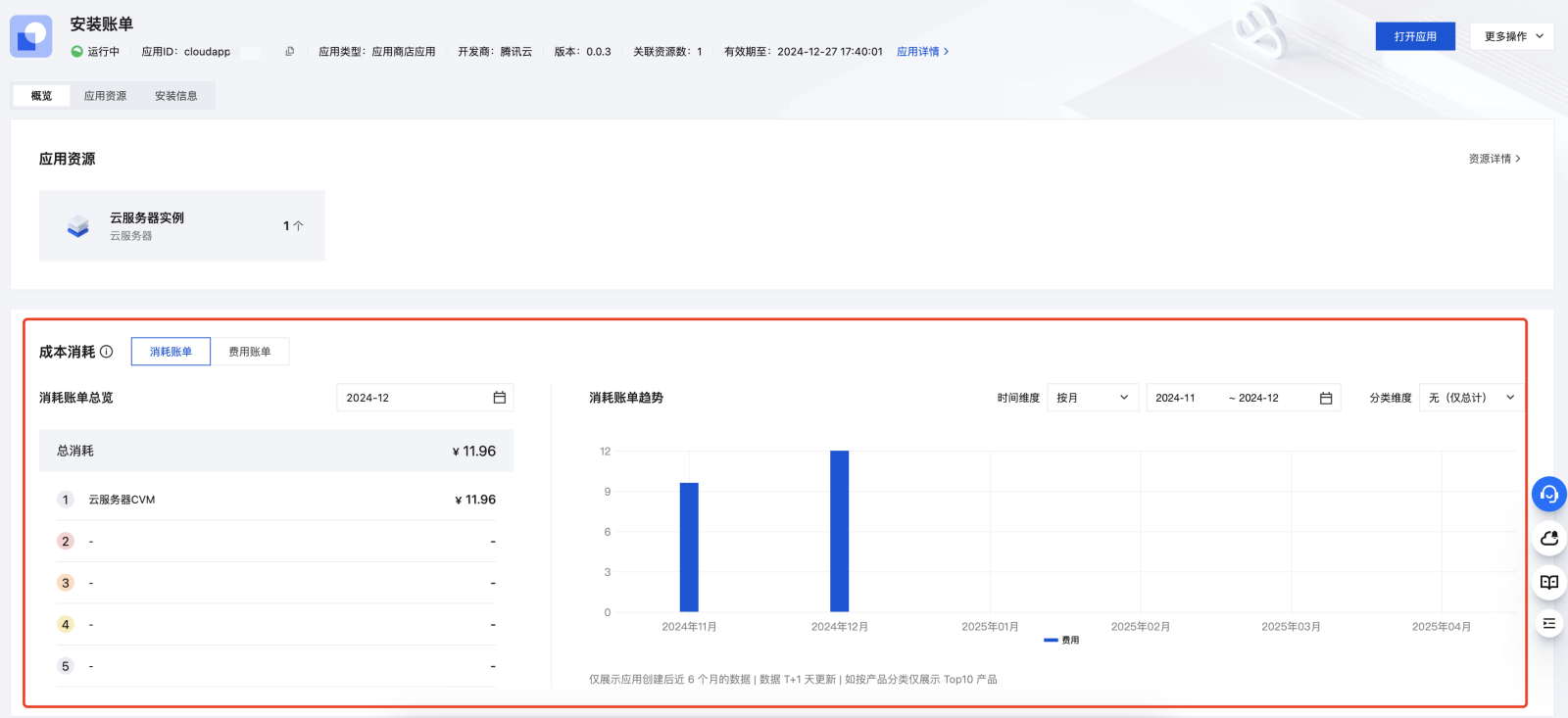 首先来到 应用视图,然后点击应用卡片可进入应用看板。如图,应用看板提供了查看成本消耗的能力,包括查看不同产品的消耗情况,以及查看成本随时间的变化趋势。除了查看成本消耗外,应用看板还可以查看应用的资源明细,API 列表,日志等信息,并提供管理应用的能力。