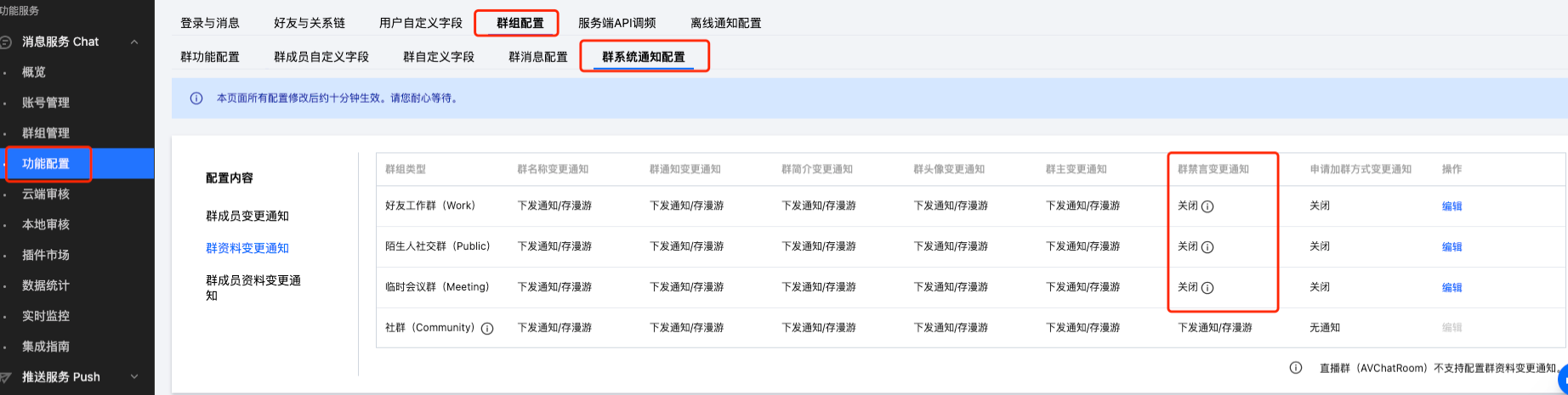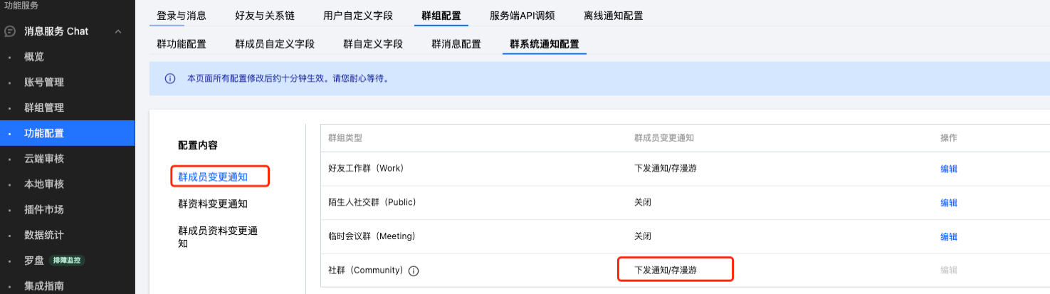 关闭:关闭之后,终端不会收到的通知,会导致无法更新群变更相关信息,也不会通过 V2TIMGroupListener 回调通知。