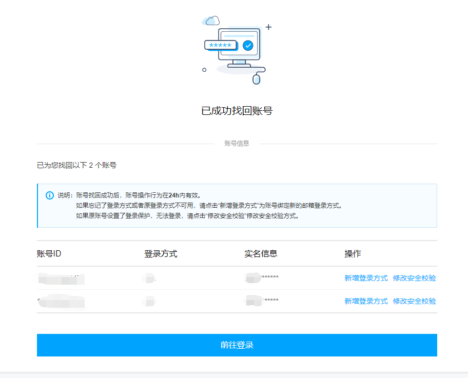 1. 单击通过身份校验重设校验方式,进入 账号找回 页面。