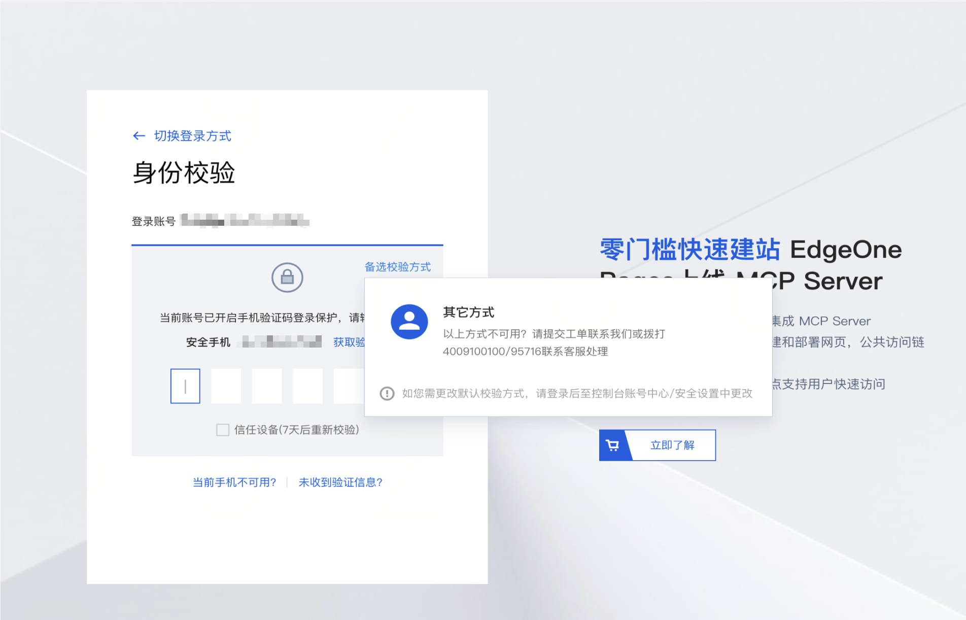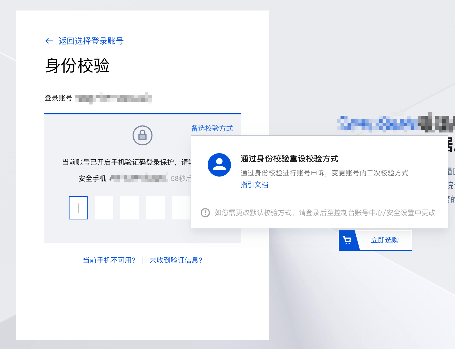 您可以单击登录页面右上方的备选校验方式代替验证。若备选校验方式不可用,如果您的腾讯云账号已经完成企业实名认证,可以通过企业信息找回账号并重设登录保护校验。