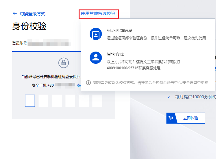您可以单击登录页面右上方的使用其他备选校验进行人脸认证,人脸认证通过后即可通过登录保护校验。
