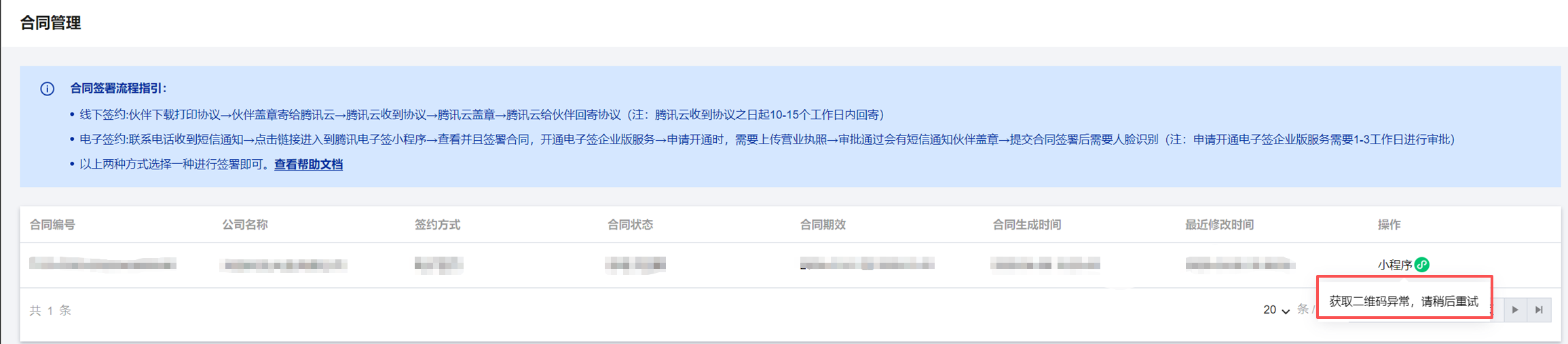 协议签署时,小程序二维码无法显示,页面提示“获取二维码异常,请稍后重试”如何处理?