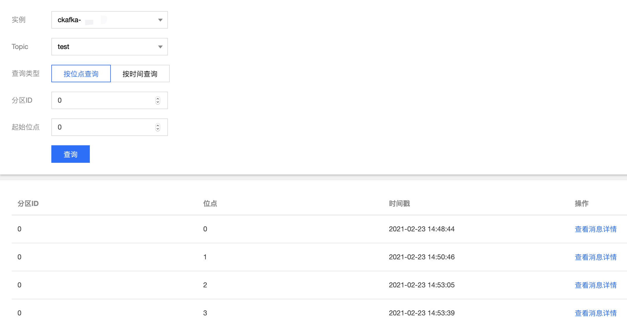 如果能够打印出 partition 和 offset,则表示当前发送的消息在服务端已经被正确保存。此时可以通过消息查询的工具去查询相关位点的消息即可。