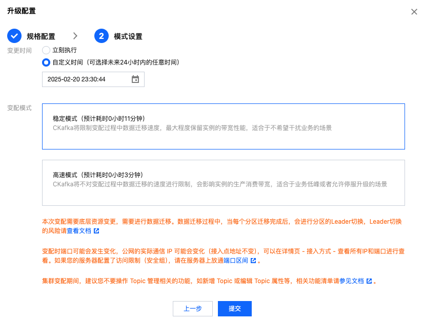 稳定模式:CKafka 将限制升配过程中数据迁移速度,最大程度保留实例的带宽属性,适合于不希望干扰业务的场景。