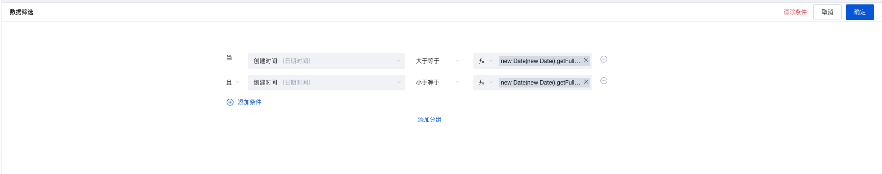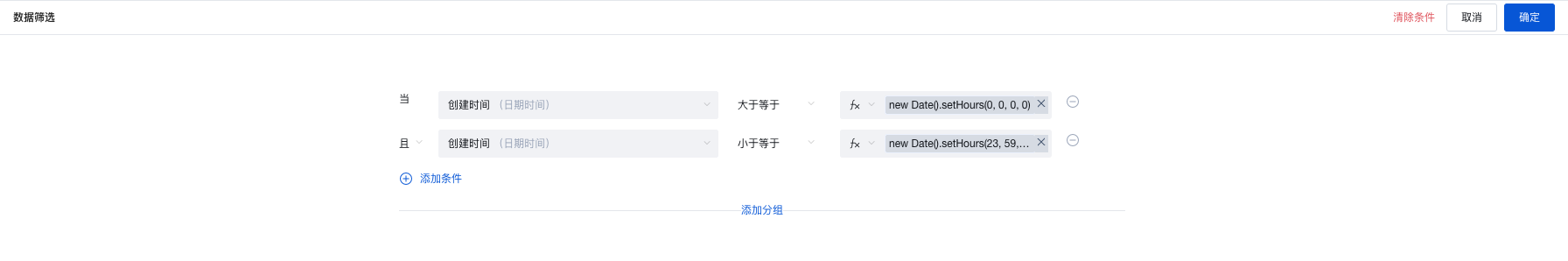 )操作符,查询方法参考上述步骤。//大于等于开始时间new Date("2025-xx-xx").setHours(0, 0, 0, 0)//小于等于结束时间new Date("2025-yy-yy").setHours(23, 59, 59, 59)