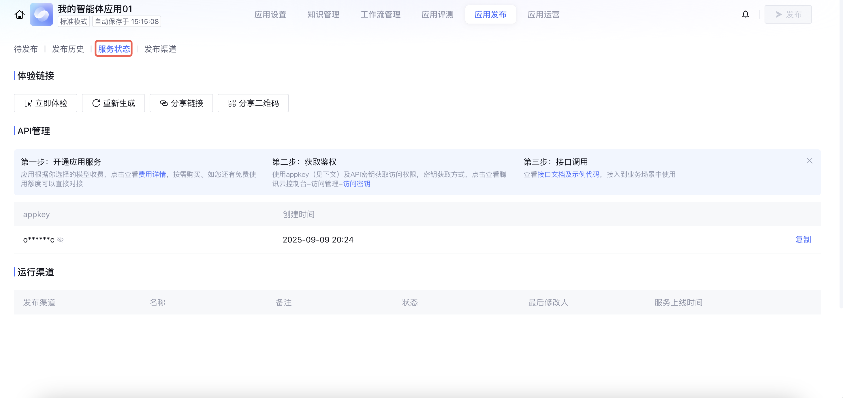 9. 发布完成后,可前往应用发布 > 服务状态查看体验链接、分享体验链接、分享体验二维码。也可查看 API key,使用 接口调用 的方式,接入到业务场景中。