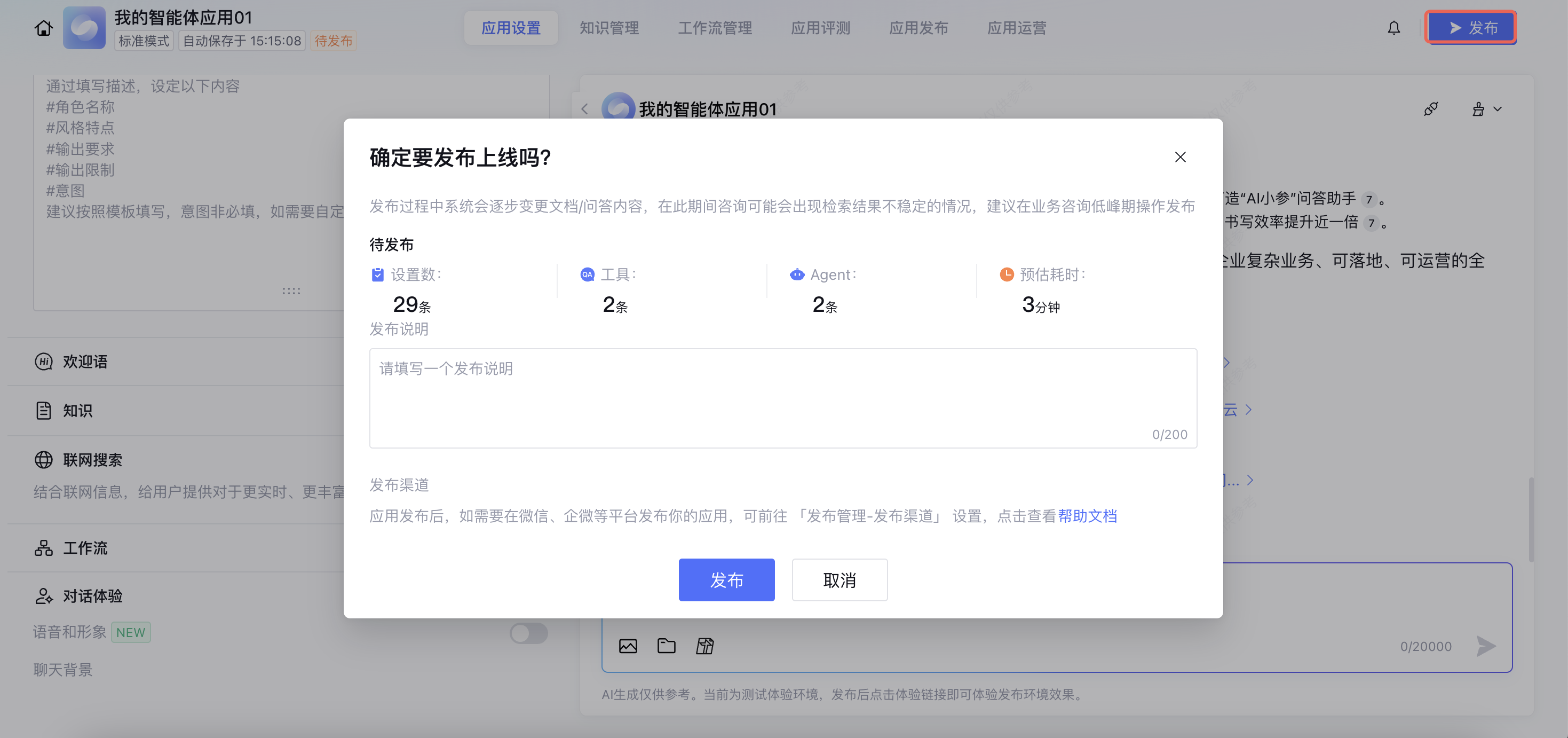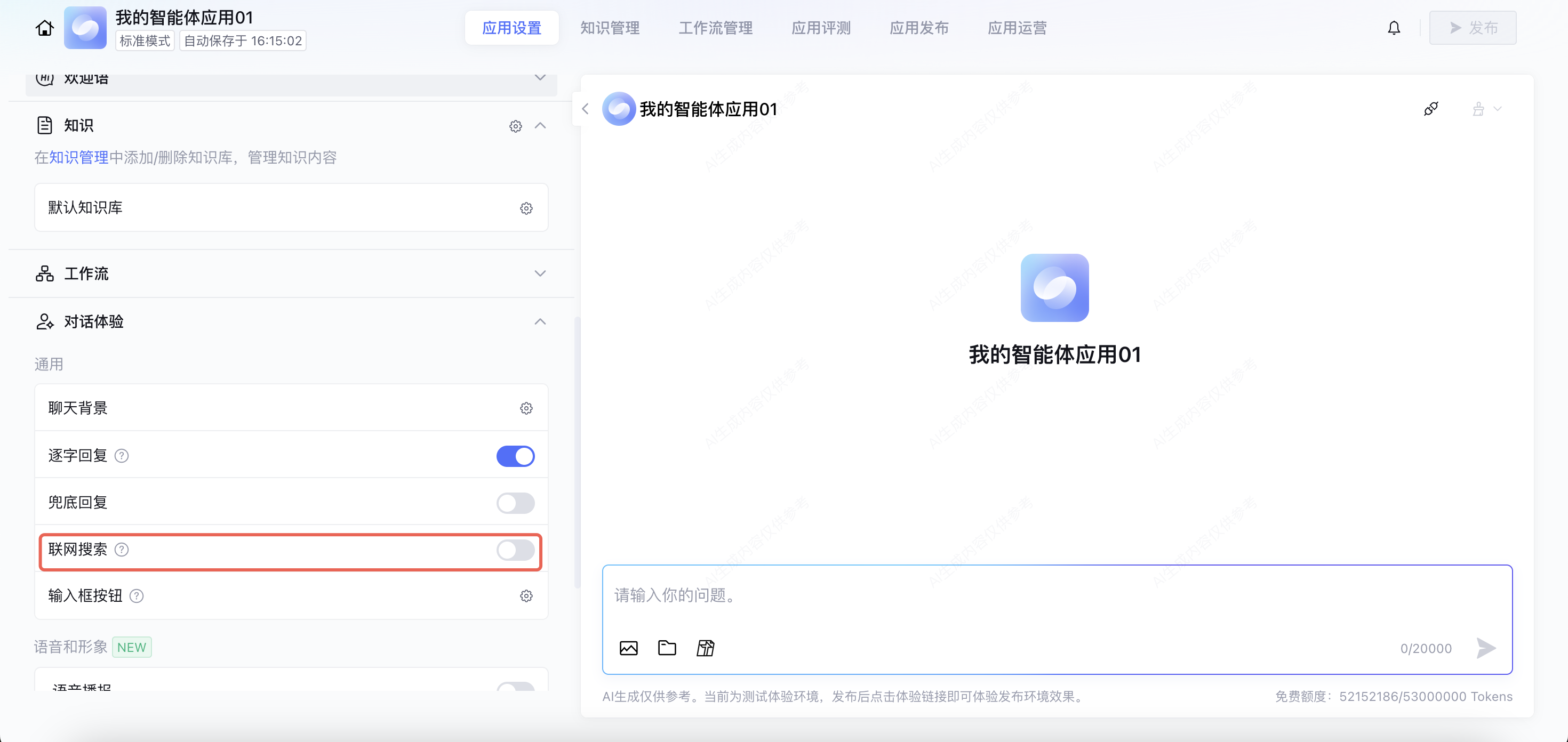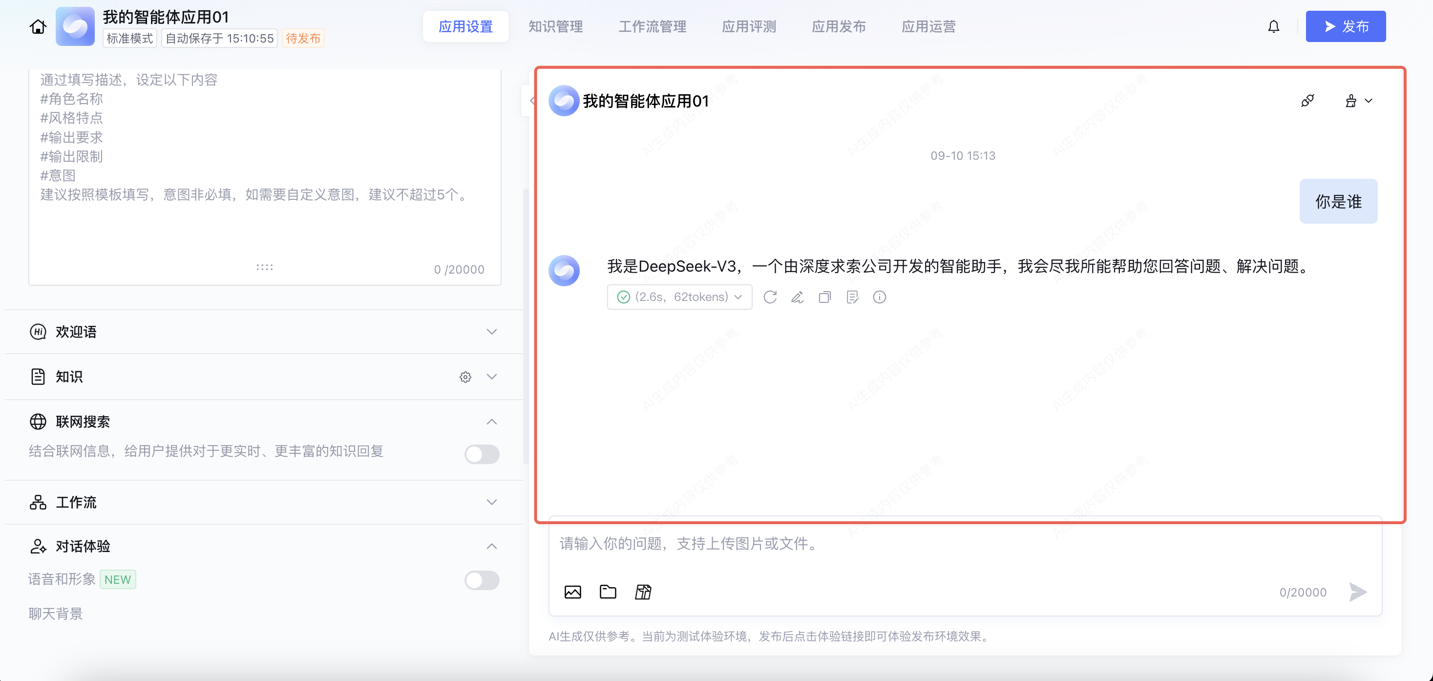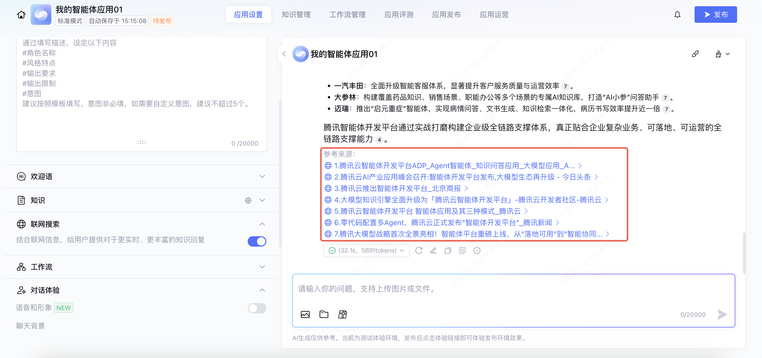 6. 配置完成后,可在对话测试窗口测试联网模式下的应用对话效果。