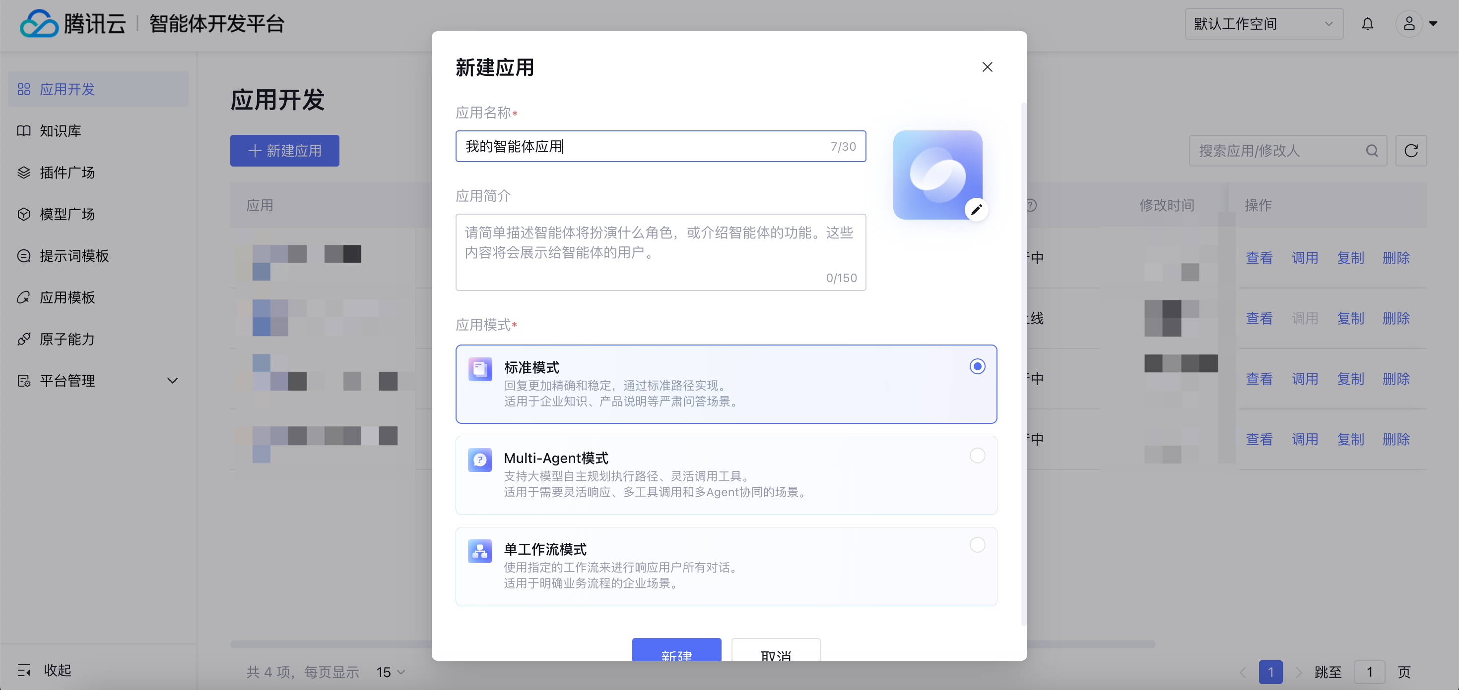 3. 登录后,进入应用开发,单击新建应用,可设置应用基础信息,例如名称、头像等。单击新建,自动跳转至应用设置页面。