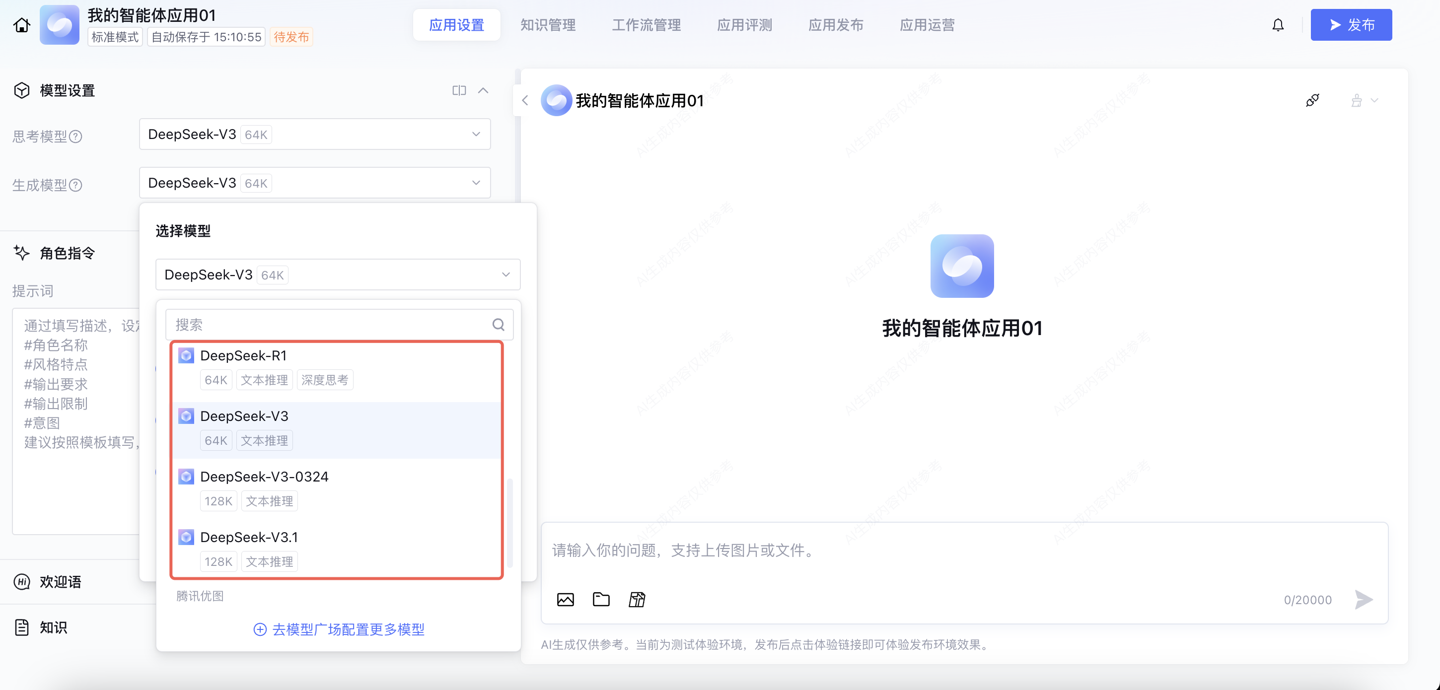 4. 应用设置页模型设置 > 生成模型,可选择 DeepSeek-R1/V3 模型。