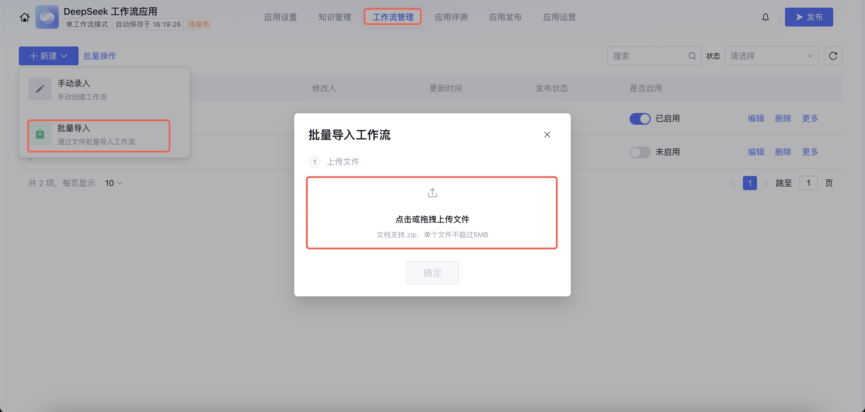 1. 新建应用后,在工作流管理界面中单击新建,将“图书馆客服服务.zip”和“图书馆客服服务-借书流程.zip”两个工作流压缩包导入至应用中。