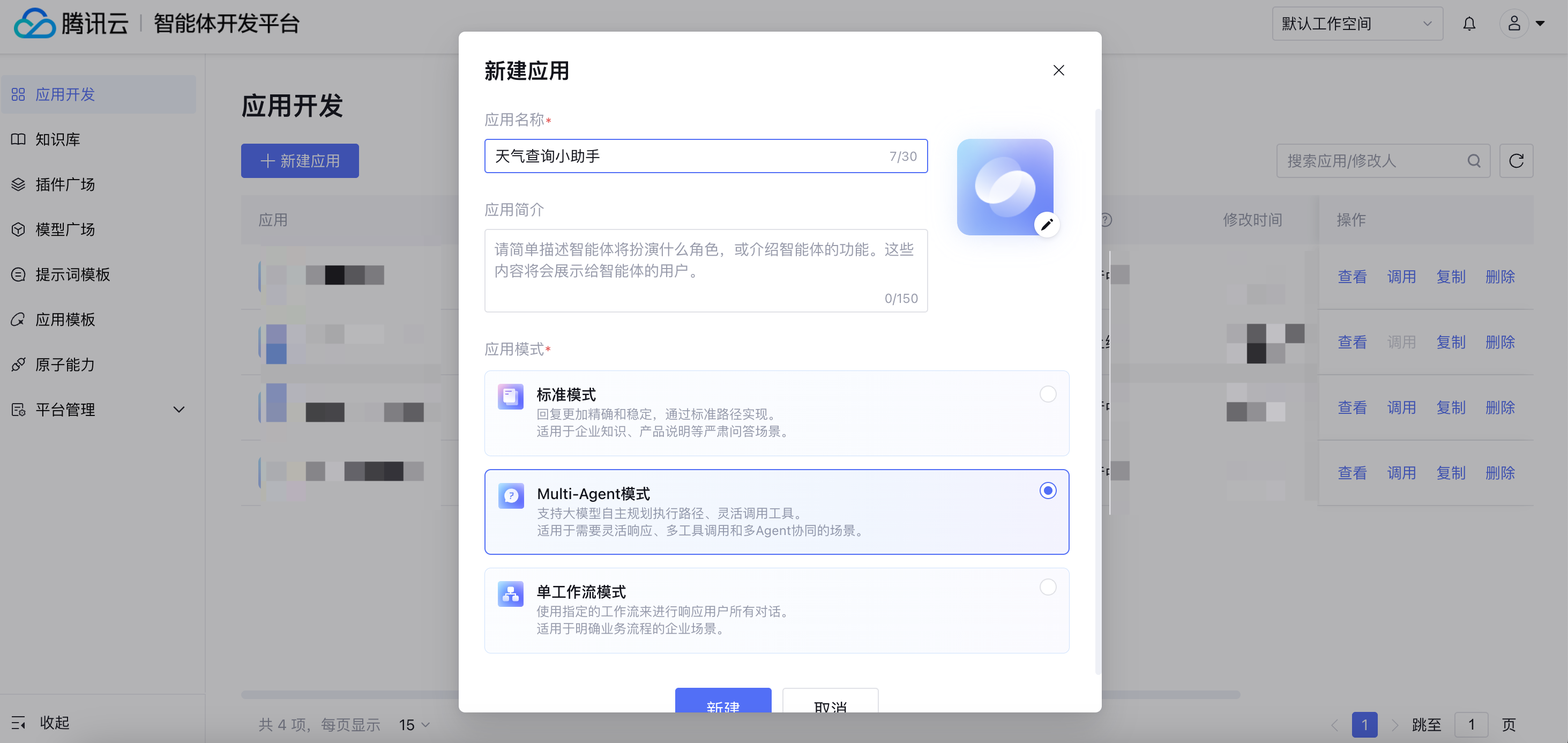 2.2 单击新建应用,输入应用名称“天气查询小助手”,输入应用简介,应用模式选择 Multi-Agent 模式。