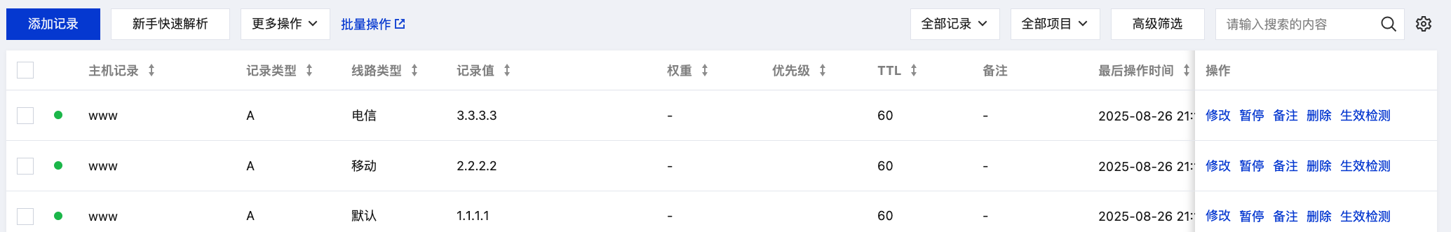 3. 单击添加记录,创建3条子域名(例如,主机记录设置为 www)的 A 记录,线路类型分别设置为默认、移动、电信,记录值分别设置为3个不同的IP 地址:1.1.1.1(默认)、2.2.2.2(移动)、3.3.3.3(电信)。如下图所示: