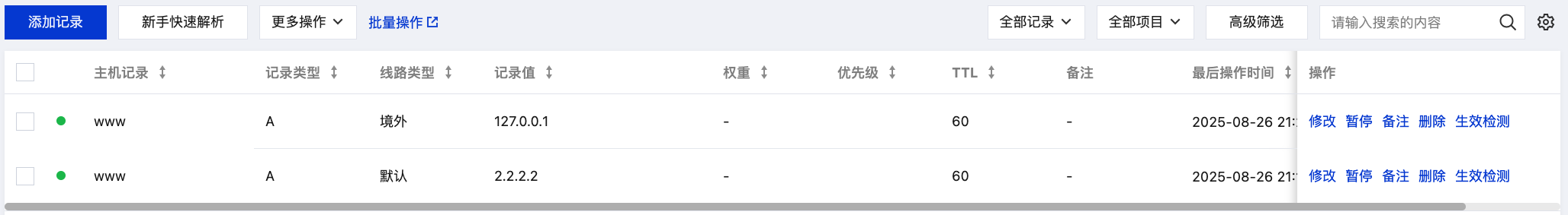 3. 单击添加记录,创建2条子域名(例如,主机记录设置为 www) A 记录,线路类型分别设置为境外和默认,记录值分别设置为 127.0.0.1(境外)、2.2.2.2(默认)。如下图所示: