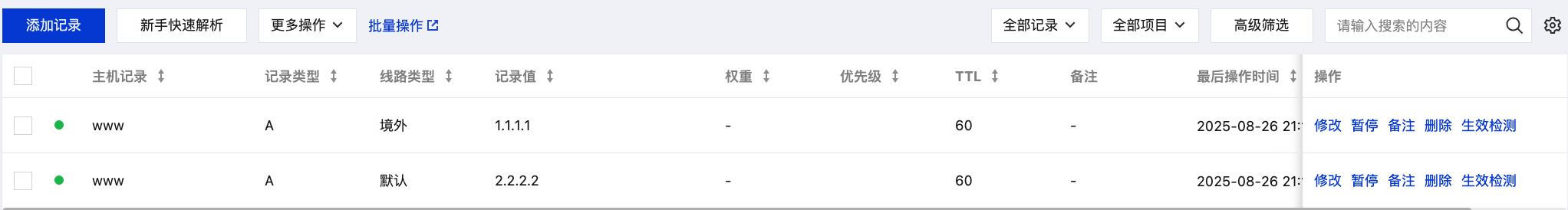 3. 单击添加记录,创建2条子域名(例如,主机记录设置为 www) A 记录,线路类型分别设置为境外和默认,记录值分别设置为 1.1.1.1(境外)、2.2.2.2(默认)。如下图所示: