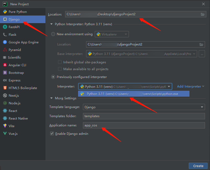 2. After installing and opening PyCharm, click on NEW project or create project, and select Django from the options.