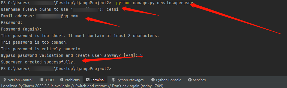 5. In the terminal, enter python manage.py createsuperuser and follow the prompts to enter the username and password.