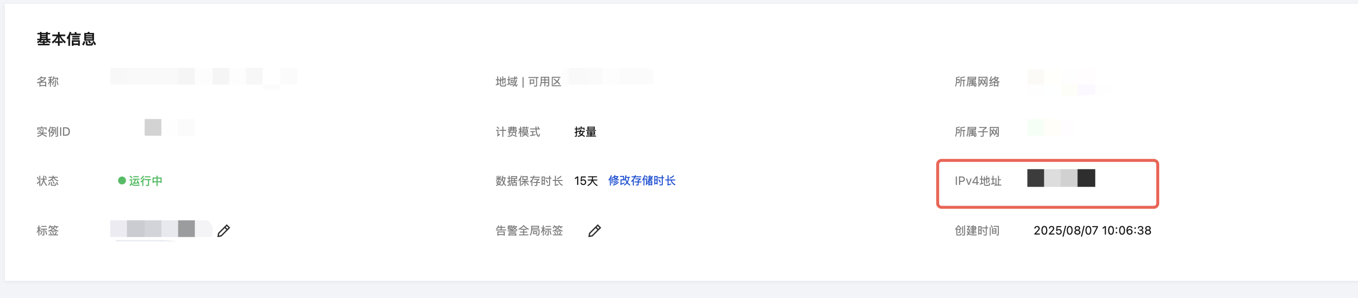2. 在实例列表里单击实例 ID,在基本信息里的 IPv4 地址即为所需替换的 Prometheus 地址。