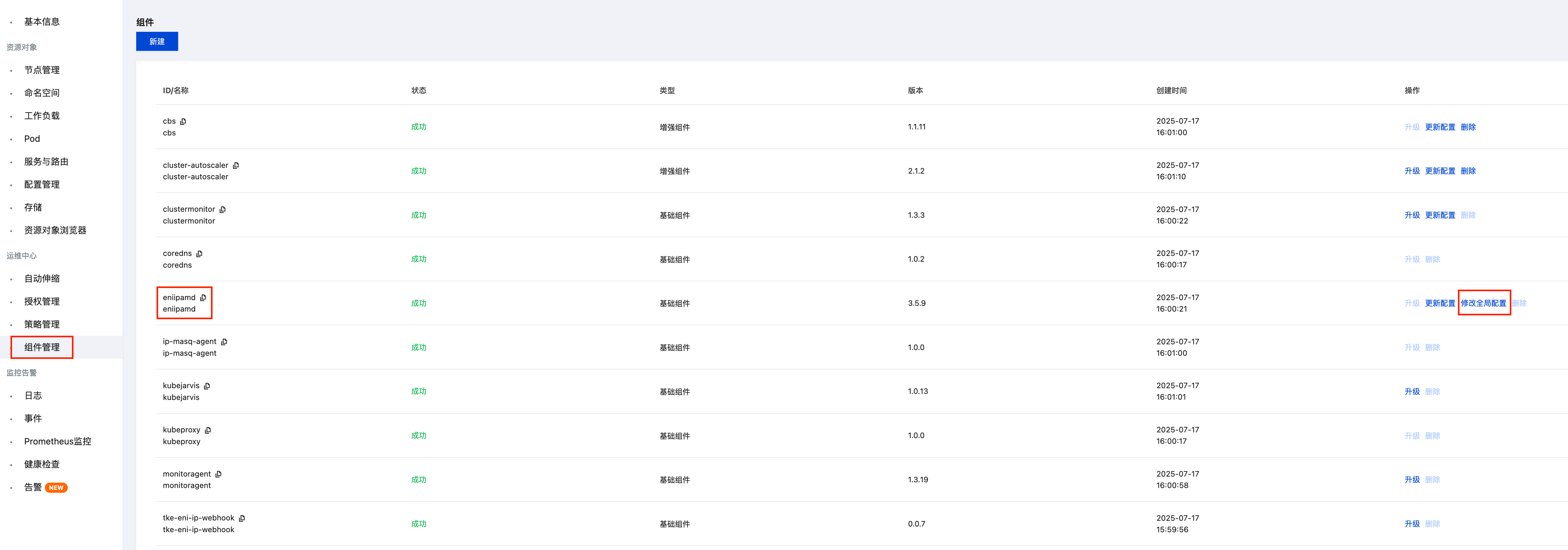 3. 在集群详情页面,选择左侧组件管理,在组件管理页面中,单击 eniipamd 组件右侧的修改全局配置。