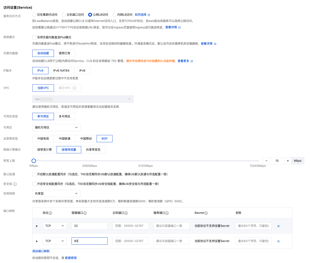 :指定端口映射。这里映射了两个端口,容器端口分别是80和22,对外暴露的端口可自行定义,对应到控制台,添加两条端口映射规则,并填写对应的容器端口和服务端口。由于 GitLab 需要提供外网访问,采用了提供公网访问。在 容器服务控制台 中,选择左侧导航中的集群。在集群详情页,选择服务与路由 > Service,单击新建,进行访问设置。如下图所示: