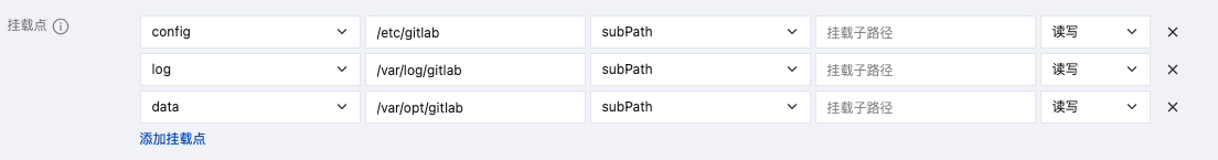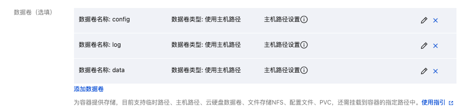 在实例内容器里面,将三个卷分别挂载到容器里。如下图所示: