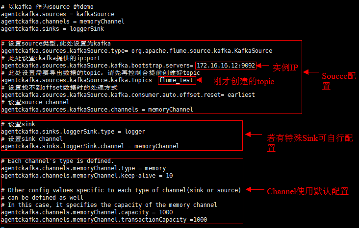 # 以kafka作为sink的demoagentckafka.source = exectailagentckafka.channels = memoryChannelagentckafka.sinks = kafkaSink# 设置source类型,根据不同需求而设置。若有特殊source可自行配置,此处使用最简单的例子agentckafka.sources.exectail.type = execagentckafka.sources.exetail.command = tail -F ./flume.testagentckafka.sources.exectail.batchSize = 20# 设置source channelagentckafka.sources.exectail.channels = memoryChannel# 设置sink类型,此处设置为kafkaagentckafka.sinks.kafkaSink.type = org.apache.flume.sink.kafka.KafkaSink# 此处设置ckafka提供的ip:portagentckafka.sinks.kafkaSink.brokerList = 172.16.16.12:9092 # 配置实例IP# 此处设置需要导入数据的topic,请先在控制台提前创建好topicagentckafka.sinks.kafkaSink.topic = flume test #配置topic# 设置sink channelagentckafka.sinks.kafkaSink.channel = memoryChannel# Channel使用默认配置# Each channel's type is defined.agentckafka.channels.memoryChannel.type = memoryagentckafka.channels.memoryChannel.keep-alive = 10# Other config values specific to each type of channel(sink or source) can be defined as well# In this case, it specifies the capacity of the memory channelagentckafka.channels.memoryChannel.capacity = 1000agentckafka.channels.memoryChannel.transactionCapacity = 1000