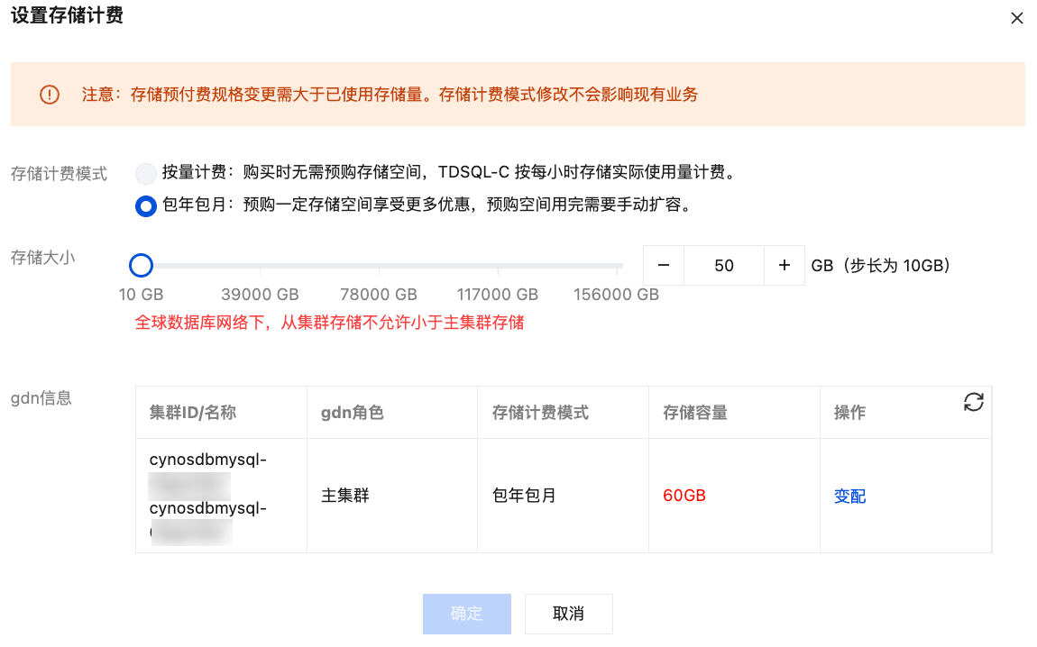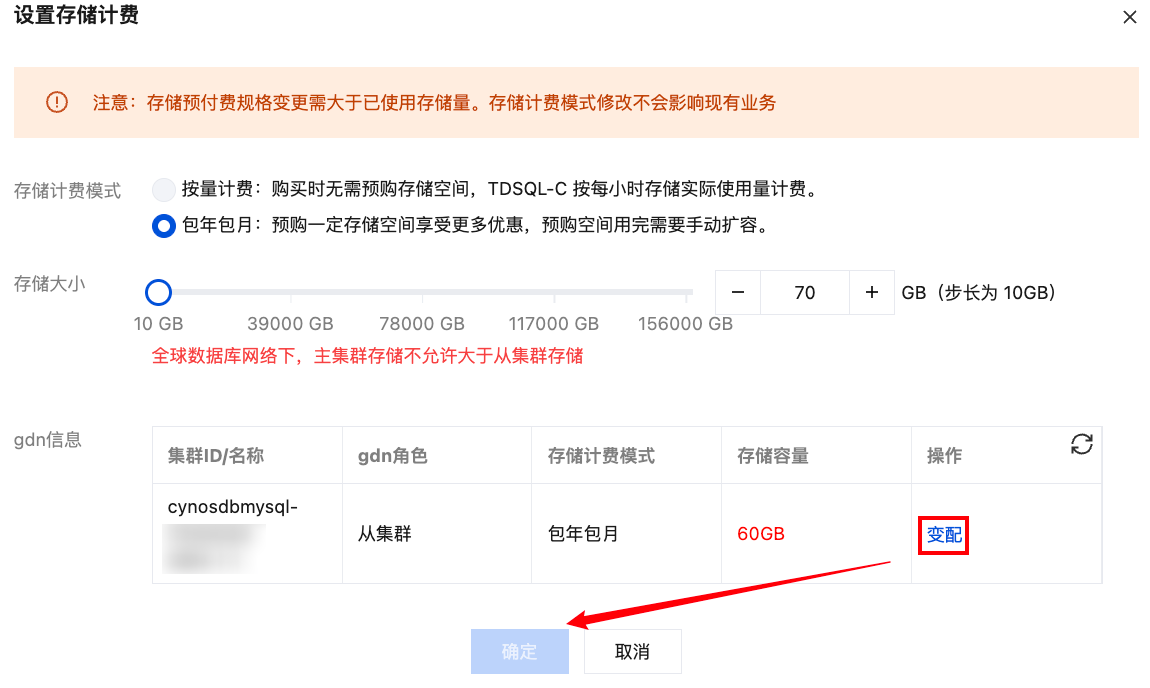 主集群存储空间计费模式为包年包月,从集群存储空间计费模式为包年包月时,在计费模式后单击编辑图标,设置存储空间大于从集群存储空间时,需先在 GD 信息列表中单击变配,将从集群存储空间先调整成目标大小,再调整主集群存储空间。
