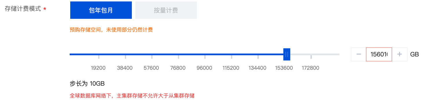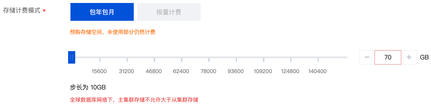 主集群存储空间计费模式为包年包月,从集群存储空间计费模式为按量计费时,如果将从集群存储空间计费模式变更为包年包月,则从集群存储空间需大于等于主集群存储空间才能操作。