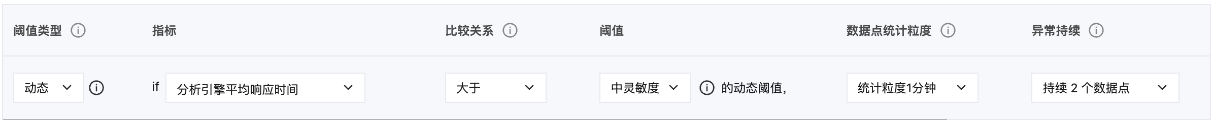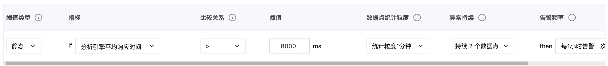 告警阈值可基于业务稳定运行期的历史最高执行时延设定(静态阈值),或根据实际延迟要求选择动态阈值(推荐中灵敏度,异常数据点 ≥ 2)。